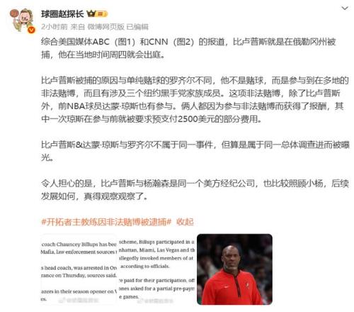 开拓者主帅比卢普斯因参与非法赌博被逮捕,该案件还涉及黑手党的非法扑克经营。