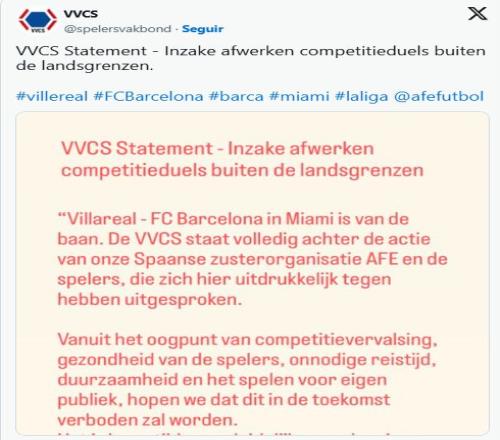 雷速体育10月23日宣 此前西班牙足协提议举办黄潜vs巴萨的西甲海外联赛,在遭到多方的反对后取消,今天荷兰足球运动员联盟公开发文表示抵制。