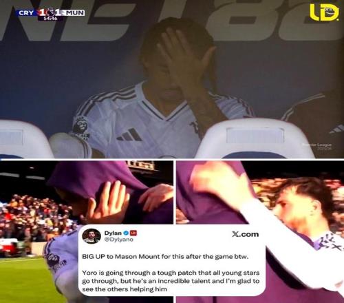 除了打入一球,芒特在赛后安抚年轻队友莱尼·约罗的举动,也让他备受赞誉。20岁的法国中卫不仅犯规送给马特塔点球,而且还有其他几次失误,幸好水晶宫没有把握好机会,否则曼联可能不只落后一球。因此,下半场初段,约罗就被阿莫林换下,他坐在替补席上掩面懊恼。