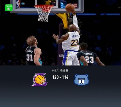 北京时间1月5日NBA 常规赛,洛杉矶湖人对阵孟菲斯灰熊。上半场湖人一度落后16分,随后湖人展开追分,半场湖人54-65灰熊,下半场湖人继续反扑完成逆转,最终湖人120-114灰熊。