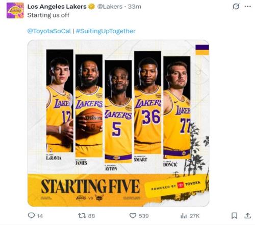 湖人:东契奇、斯玛特、拉拉维亚、詹姆斯、艾顿;