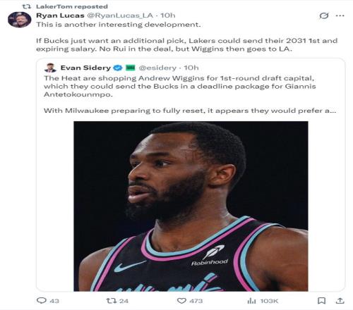 除此之外,根据《福布斯体育》记者埃文-斯迪瑞的报道,热火队正在兜售威金斯,他们为了追求扬尼斯希望从嘴哥的交易中得到一个首轮签为回报,湖人可以送出他们2031年无保护的首轮签,而且在交易中无需纳入八寸垒,只要湖人愿意送出首轮签就可以得到威金斯。