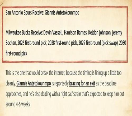 8换1!美媒建议马刺加入字母哥争夺战,联手文班亚马,即刻冲冠