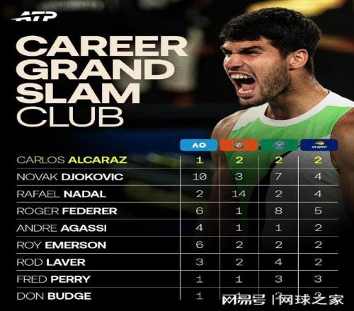 而首次称霸澳网的阿尔卡拉斯,成为历史上第9位完成职业生涯全满贯壮举的男子球员,正式加入网坛最顶级俱乐部。同时,阿尔卡拉斯也创造了属于他自己的纪录,这就是以22岁272天的年纪打破了由同胞前辈纳达尔保持的最年轻全满贯纪录(24岁101天)。