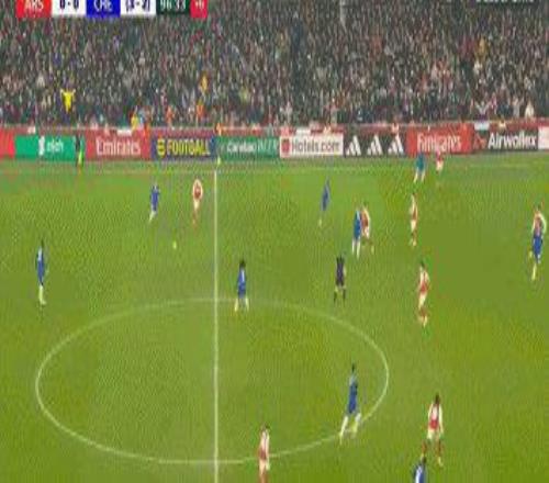 90+7’阿森纳打出反击,赖斯转移给空当处的哈弗茨,德国前锋晃过门将罗伯特·桑切斯冷静打入空门。